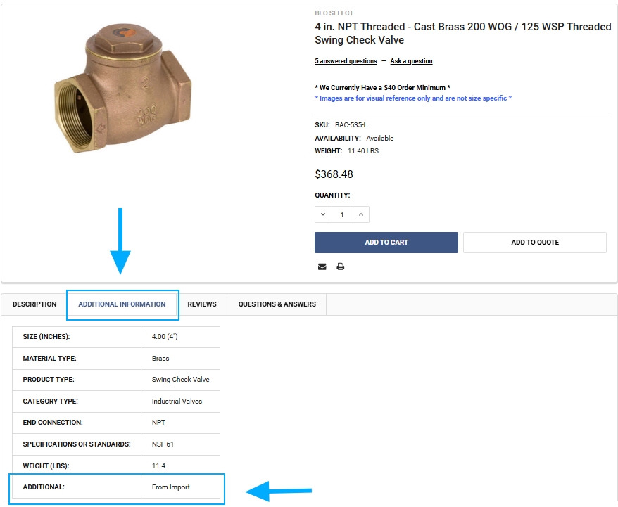 The 4 in. NPT Threaded - Cast Brass 200 WOG / 125 WSP Threaded Swing Check Valve is from import (China, Thailand, etc.). In some cases, country of origin is subject to change as we have multiple manufacturers for the same item. All products that are domestic / Made in USA will have that listed on the product name itself. Import and domestic origin information for all items can also be found in the product details for each item under the "Additional" tab. If you require domestic or a specific country of origin - please email our team at bfo@qmctechnologies.com with the quantity and your origin requirements.