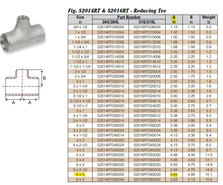 length over all for 6" section 6 in. x 3 in. Reducing Tee - Schedule 40 Welded - 316/316L Stainless Steel Butt Weld Pipe Fitting Reducing Tees
